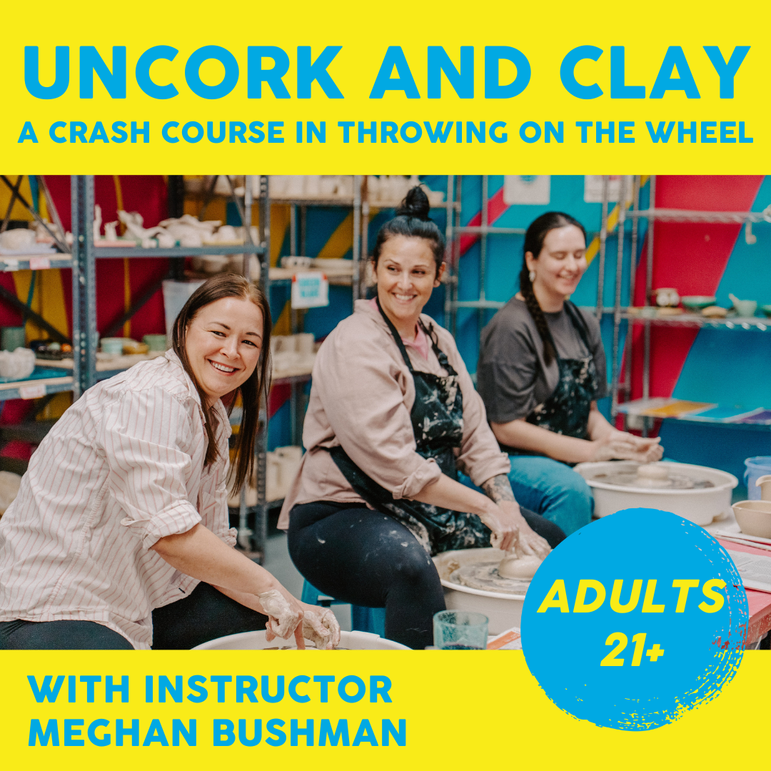 Don’t have the time to commit to a 4 week pottery course? Just want a fun afternoon out to try a new skill? Join us for a crash course in throwing on the wheel! Instructor Meghan Bushman will walk you through the steps to have you slinging mud (the clay kind) in no time. The pottery wheel is one of the trickier art skills to master, but it is buckets of fun. Dress to get messy and feel free to BYOB, all pottery materials are provided. Uncork a bottle of your favorite sparkling water or wine and come “clay” with us! There are only 7 spots available for our 7 wheels, bring a friend/date/sibling/neighbor or come make new friends!